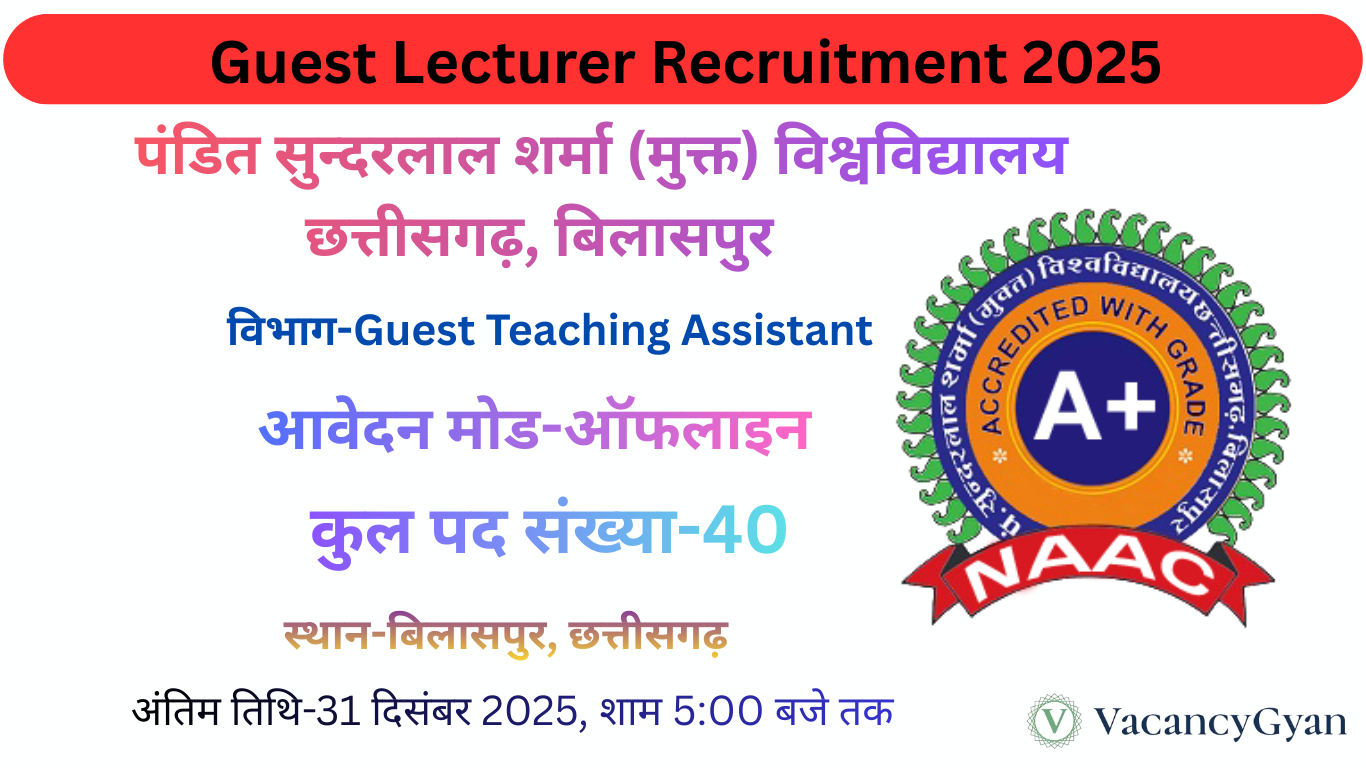 पंडित सुन्दरलाल शर्मा (मुक्त) विश्वविद्यालय छत्तीसगढ़, बिलासपुर ने शैक्षणिक सत्र के लिए विभिन्न विषयों में अतिथि व्याख्याता (Guest Lecturer) और अतिथि शिक्षण सहायक (Guest Teaching Assistant) के रिक्त पदों पर भर्ती के लिए आवेदन आमंत्रित किए हैं।